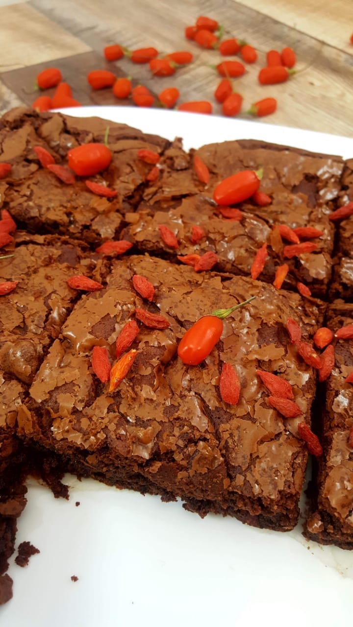 Die Eier mit dem Rohzucker 2-3 Minuten schaumig schlagen Schokomasse hinzugeben. Mehl mit Natron, Kakaopulver und Salz vermengen und mit der Eiermasse verrühren. 50 Gramm frisch Goji-Beeren unterheben. Den Teig in das Blech geben, glattstreichen und im vorgeheizten Ofen circa 25 Minuten backen. Wenn er fertig gebacken ist, etwas abkühlen lassen und stürzen. Mit ein paar getrocknet Gojibeeren bestreuen. |