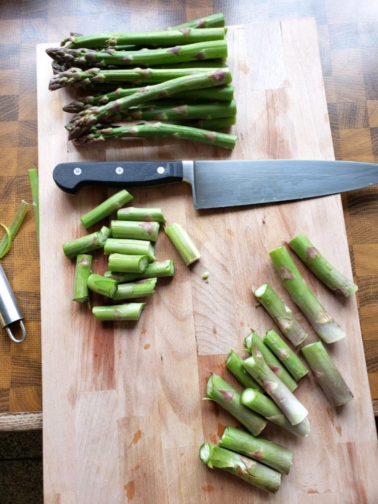 Spargel waschen, die holzigen Enden abschneiden und das untere Drittel der Stangen schälen. Spargelspitzen abschneiden und beiseitelegen. Spargelstangen in ca. 2-3 cm dicke Scheiben schneiden. Für die Spargelspitzen 250 ml Wasser mit etwas Salz zum Kochen bringen. Spargelspitzen hineingeben und in ca. 5 Min. bissfest garen, herausheben und kalt abschrecken. |